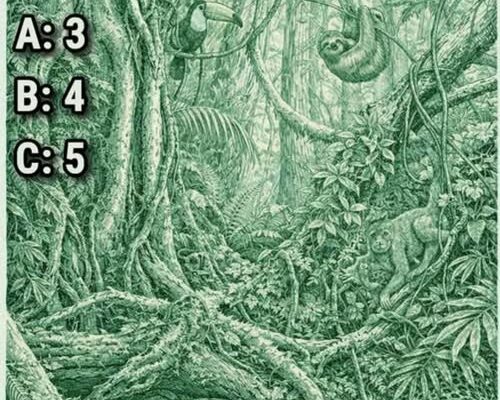At first glance, this dense green jungle illustration looks like an ordinary forest scene. Thick tree roots twist across the ground, vines hang from branches, and layers of leaves create a rich canopy of texture. But hidden within the image are several animals camouflaged in the foliage.