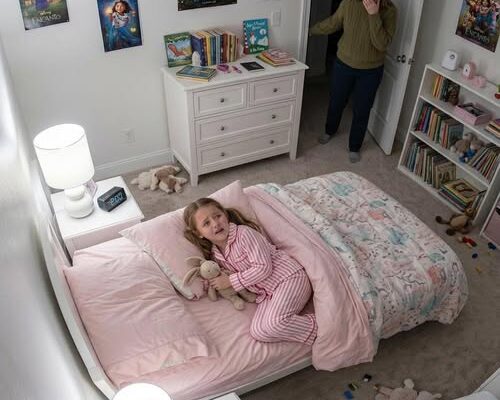 I stared at the phone screen, trying to convince myself that I was imagining it. The grainy black-and-white night-vision image showed Mia lying motionless on her side, her small chest rising and falling steadily with each breath. The room remained quiet. The only motion came from the faint sway of the curtain near the window. For a moment the mattress stopped shifting and everything appeared normal again.