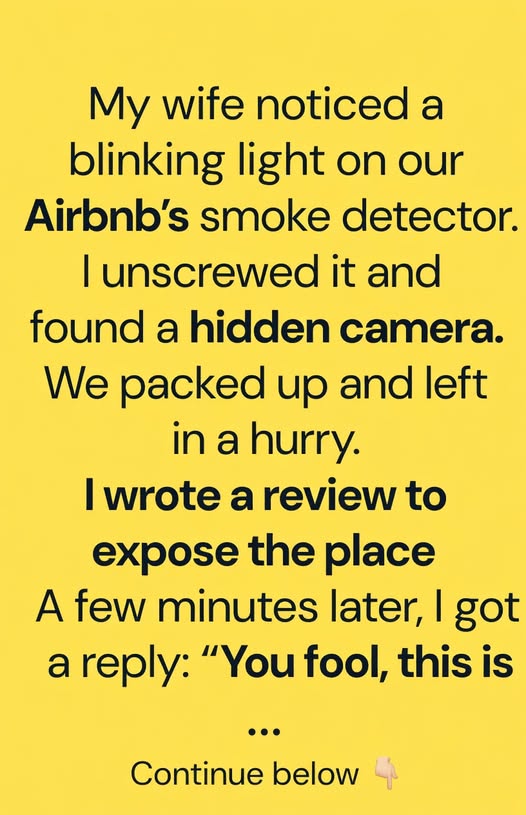 The host explained that a previous guest had repeatedly caused property damage and even attempted to break in later. The hidden “camera” wasn’t a real camera at all—it was a small, blinking sensor connected to a home security network that alerted them to tampering. The real smoke detector was on the ceiling, and what I removed was part of a motion alarm system disguised for aesthetic reasons.