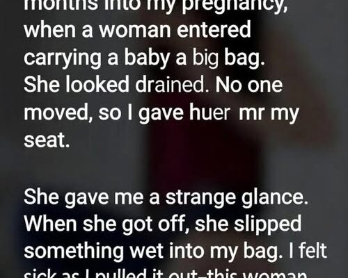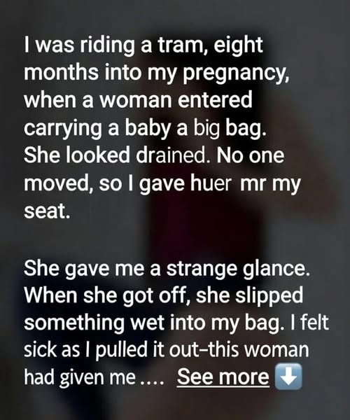 I was eight months pregnant, sitting on a tram, when a woman stepped in holding a baby and a large bag. She looked absolutely drained. No one moved, so I gave her my seat. She gave me a strange glance, and when she got off, she slipped something wet into my bag.