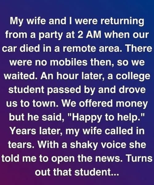 My wife, Amrita, and I sat there in silence, the engine dead and the road completely empty. There was no phone signal, no sign of help, only the faint stars above us. The minutes felt longer and heavier as we waited, uncertain whether anyone would pass by. Then, after what seemed like an eternity, headlights appeared in the distance. A worn Toyota Corolla pulled over, and a young man stepped out. Without hesitation, he offered to help. He refused any payment and simply said he was happy to be of assistance.