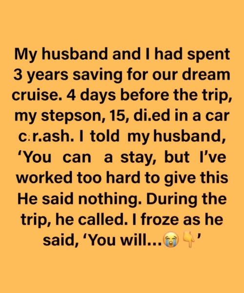 A sudden phone call delivered devastating news—her husband’s 15-year-old son had died in a tragic, unexpected accident. The house was immediately overtaken by grief and shock. To everyone around her, the expectation was obvious: cancel the trip, stay home, and mourn together. But inside Sandra, a quiet conflict began to grow. After years of always putting others first, she found herself asking something she had never dared to consider: even now, was she allowed to choose herself?