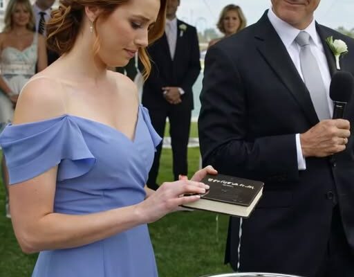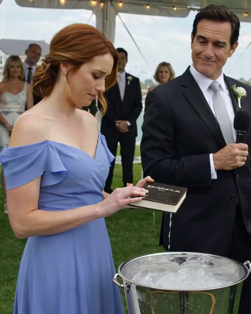 He walked right to the champagne bucket—silver, sweating, packed with melting ice—and dropped that book straight in like it was garbage he didn’t want on his hands.
